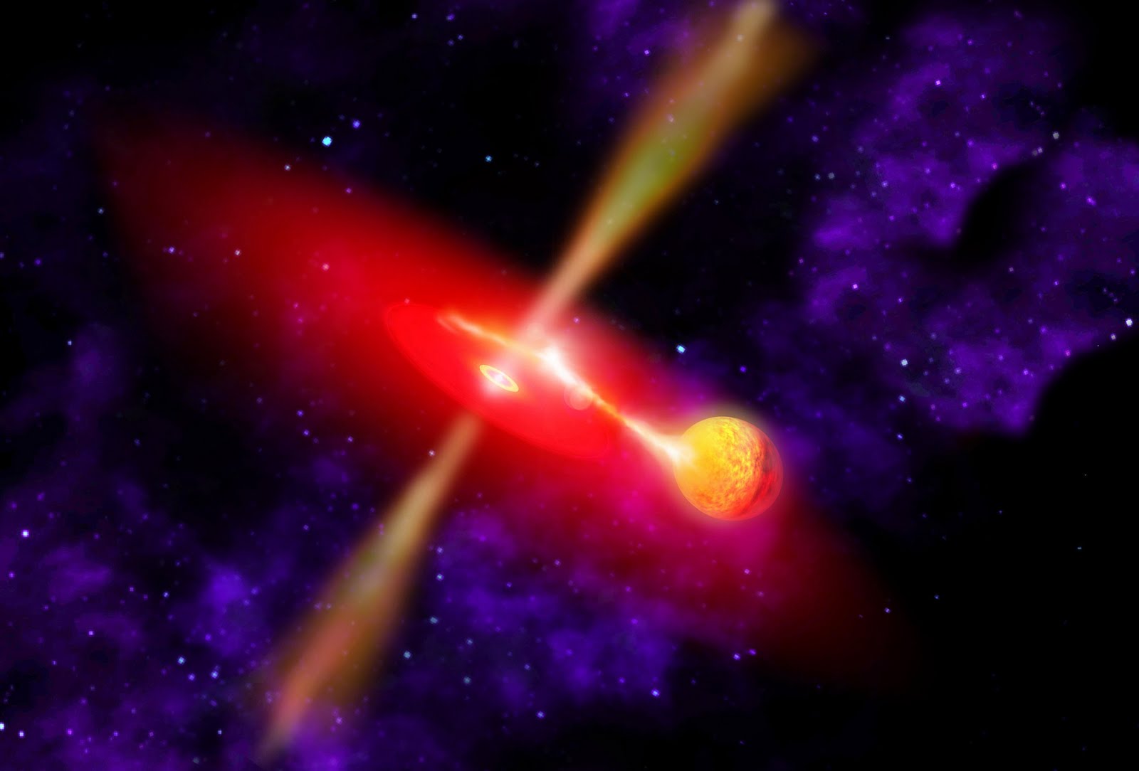 Representación gráfica de un agujero negro y una estrella. De la estrella se desprende material que se acumula en un disco de acreción alrededor del agujero negro. Siendo al final este material engullido por el agujero negro. Credit: NASA