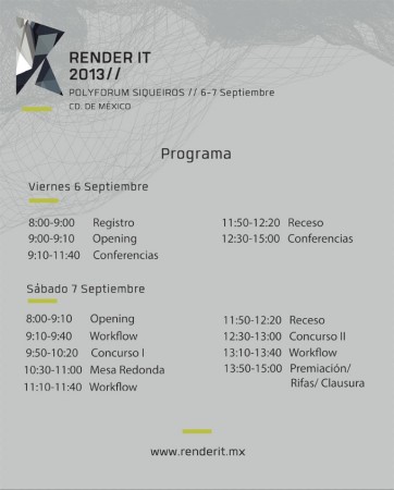 Render It es el congreso más importante en relación a la visualización 3D con la participación de 10 expertos locales y extranjeros que hablarán y expondrán la vanguardia de la digitalización del diseño dentro de conferencias, workflows y mesas redondas. Dará lugar los próximos días 06 y 07 de septiembre en el Polyforum Siqueiros de la Ciudad de México.