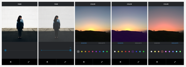 Color es una herramienta similar a la que ya tienen otras aplicaciones como VSCO. Su funcionamiento es sencillo. Permite alterar la tonalidad de ls luces y las sombras de una fotografía mediante tonos predeterminados en una paleta. En cuanto a Fade, se trata de una herramienta para reducir simultáneamente los tonos y el contraste de la imagen y darle un acabado desgastado o viejo.