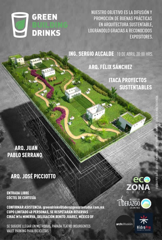 Green Building Drinks es un evento de networking, organizado por el Instituto de Liderazgo Sustentable, que tiene como objetivo promover y difundir buenas prácticas de arquitectura sustentable. Para esto, se convoca a un arquitecto a exponer en una plática breve su experiencia en la aplicación de estrategias de diseño en la arquitectura.